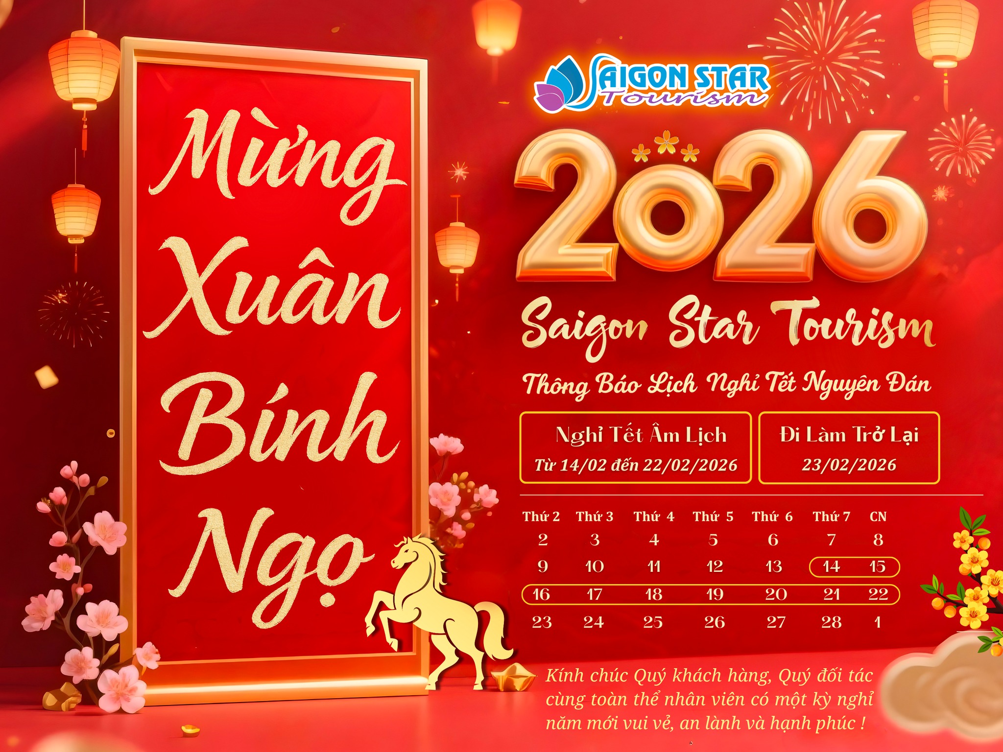 Mùa xuân Bính Ngọ 2026 đang gõ cửa, mang theo hơi ấm của sum vầy, niềm vui đoàn viên và những khởi đầu đầy hy vọng. Trong khoảnh khắc ý nghĩa này, Saigon Star Tourism xin trân trọng gửi lời cảm ơn chân thành đến Quý Khách hàng, Quý Đối tác đã luôn tin yêu đồng hành, và đặc biệt là đội ngũ nhân sự tuyệt vời đã cùng nhau nỗ lực hết mình trong suốt một năm qua.